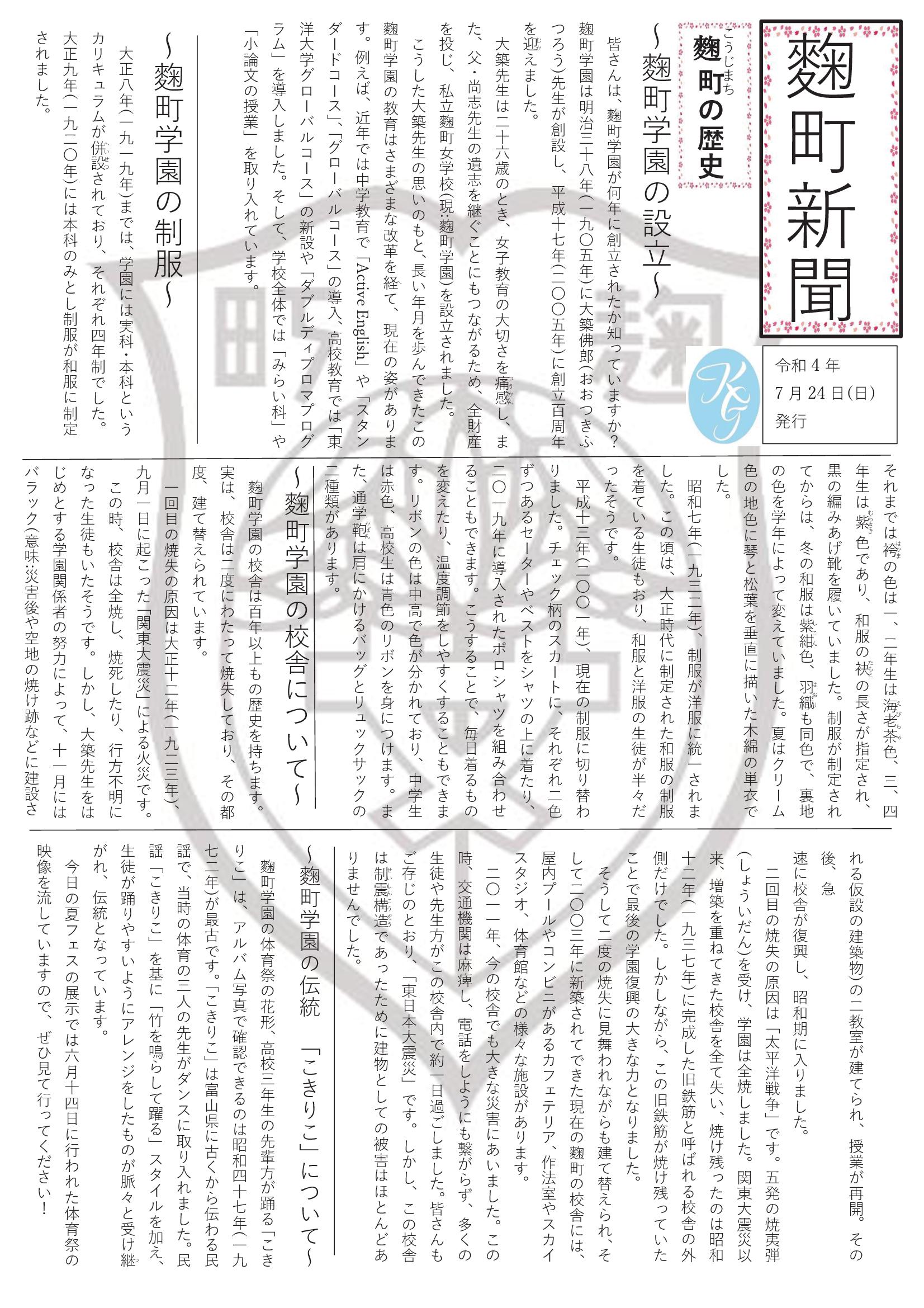 Active Englishなどの教育改革を説明会ではお話することが多いですが、今年で117年を迎える伝統校としての麹町学園を生徒たちは新聞としてまとめてくれました。