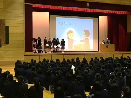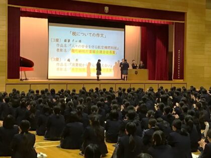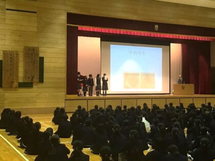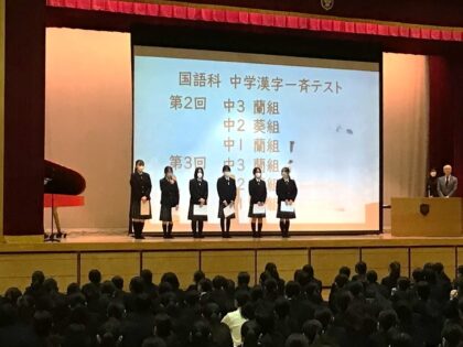 税についての作文、漢字・語彙テスト、水泳部や書道部の大会・展覧会での活躍、そして日々の学習を支えるMANABU roomの利用者表彰など、多くの生徒の頑張りが称えられました。