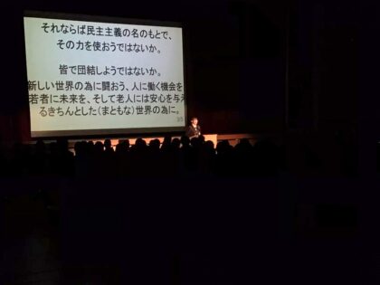 事前に各クラスで予選を行い、選ばれた代表生徒が、アリーナに集まった全校生徒の前で課題文のスピーチを披露しました。